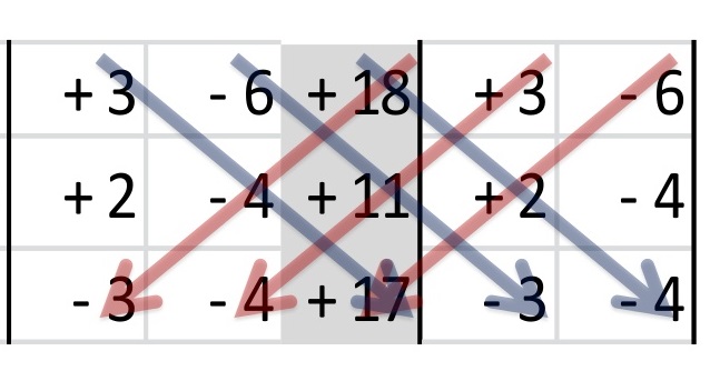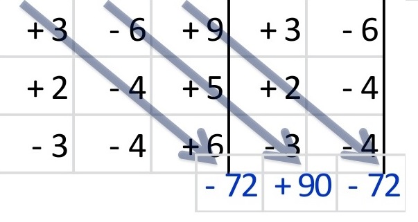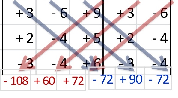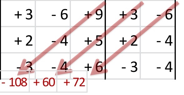 Se multiplican las 6 diagonales (no olvides cambiar los signos en tres de ellas) y se suman los seis resultados de ellas.